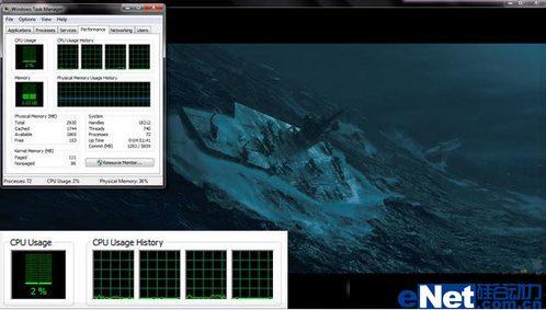 我们来测试一下 Core i5-520UM 这个处理器播放 HD 高画质影片的效果。直接播放 H.264 的 1080p 高画质影片,若是没有硬件加速功能的帮助,CPU 使用率也不会超过 40 %,播放过程一切顺利。若是有硬件加速功能的帮助,CPU 使用率多数时间都在 6 % 以下徘徊,播放高画质影片毫不费力。