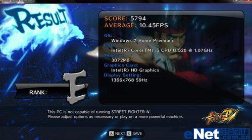 用 Street Fighter4 Benchmark 这套测试软件检视 Intel GMA HD 的图形效能。在 1366 x 768 的最高屏幕分辨率之下,关闭垂直同步功能且关掉反锯齿功能,其它完全用 Street Fighter4 Benchmark 的初始设定值来做测试。结果平均 FPS 仅仅只有 10 左右,总分 5794 分,等级为 E。