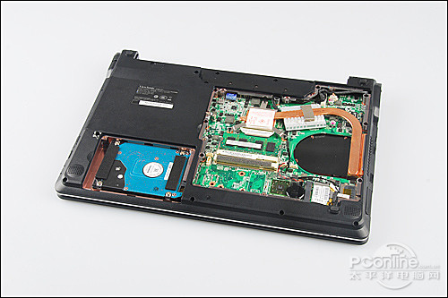 这款产品为用户提供了较好的硬件拓展能力,拆开机身背面的档板我们可以清楚的看到硬盘,内存以及无线网卡,这为用户自行更换某些设备提供了便利。