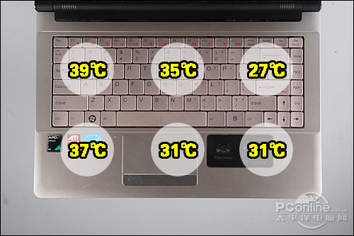 从测试图上可以看到,VNB142对C面的发热量控制还算不错,整个键盘区域都没有超过40℃。由于接近CPU和出风口,机身左侧的位置温度较高,这一侧的温度均处于37度左右或者39度以下,尽管发热区域面积较大但仍然维持了一个较好的散热表现。所以在全功率使用条件下用户会稍有温热的感觉,但不会影响使用中的舒适度。