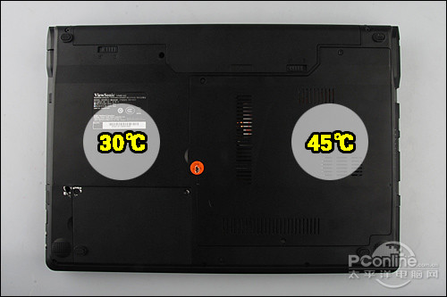 而D面的发热区域与C面吻合,其主要硬件所在的区域的温度达到了45℃,出风口的温度也接近50℃,尽管左侧的温度比较舒适。但D面整体温度说明VNB142不适宜被用户放在腿上使用。