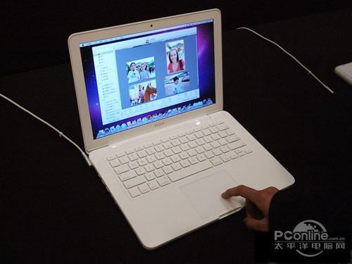 外观上,一向秉承简约美的苹果当然也不会给MacBook MC516披上花蝴蝶的外衣,MC516采用纯白色外观设计,秉承了苹果一贯的简约唯美设计风格,纯白色机身打上苹果LOGO,简单时尚。采取unibody一体成型技术,组装起来内部结构更加扎实,同时还柔化了机身边缘,整个机器浑然一体。该本本采用了全尺寸无按键玻璃触摸板,支持4指多重触摸。13.3寸的屏幕仍然坚持16:10比例,1280*800的分辨率。LED背光屏的表现非常的出色,亮度浑厚而到位,色彩十分艳丽。