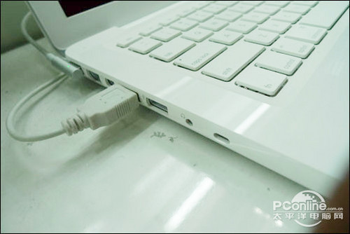 接口方面,这款笔记本采用了一个数字音频输入/输出接口,提供2个USB2.0接口,Mini DisplayPort 端口。VGA接口和HDMI接口都必须通过原配的DVI转接器由DVI口扩展而出。内置蓝牙2.1+EDR,AirPort Extreme Wi-Fi(IEEE 802.11n)及摄像头。
