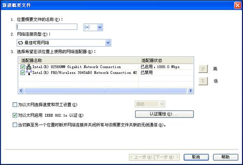 第二步,同样,打开Access Connections程序,创建无线接入概要文件(图9),重复“图2”的操作即可。注意,在“2.网络连接类型”要选择“无线LAN(802.11)”连接类型,而“3.选择希望在该位置上使用的网络适配器”则会根据你在“2.网络连接类型选项”中的选择而变化,例如:你如果选择了“无线LAN(802.11)”,下方“3.选择希望在该位置上使用的网络适配器”则只选择ThinkPad内置无线网卡,其它选项保持软件默认设置即可。