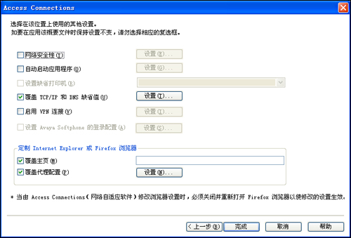 第三步,在Access Connections详细网络设置界面(图3)中,日常网络环境只需要勾选“覆盖TCP/IP和DNS缺省值”与“覆盖代理设置”即可,注意“覆盖TCP/IP和DNS缺省值”只设置你的网卡地址,“覆盖代理设置”则设置IE浏览器的“代理服务器”地址,如果接入的网络不需要代理即可上网,那么只勾选“覆盖TCP/IP和DNS缺省值”并设置即可。勾选后不要点击“完成”,还要对“覆盖TCP/IP和DNS缺省值”与“覆盖代理设置”进行设置。