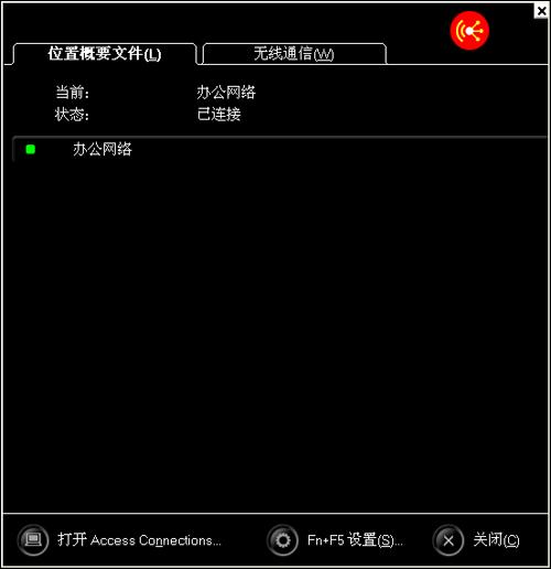 除主程序外,Access Connections还有方便的快捷按键与菜单可使用,使用Fn+F5快捷按键呼出菜单选项。在呼出的Access Connections菜单中,可简单查看当前有线连接与无线连接状态。