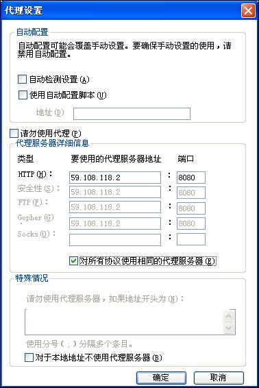 第五步,点击“覆盖代理设置”后面的“设置”按钮,跳出“代理设置”选项卡,如果不需要代理设置只需勾选“自动检测设置”即可,如需要代理服务器设置,需要把“请勿使用代理”选项前面的勾去掉,然后在下方“HTTP”填处入代理服务器地址,并勾选“对所有协议使用相同的代理服务器”,填写完成后点击“确定”按钮保存即可。