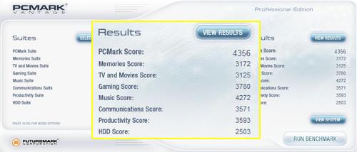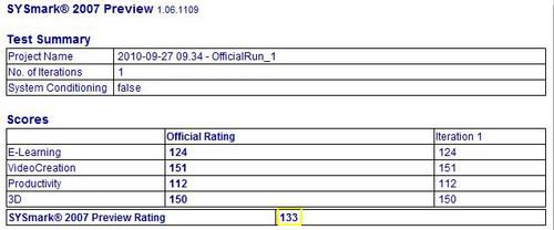 SYSmark 2007通过模拟用户的各种真实操作环境来衡量整机的性能表现,133分的综合分数很好的印证了整机的中高配置,PCmarkVantage的分数分布也体现出整机并没有短板的存在。