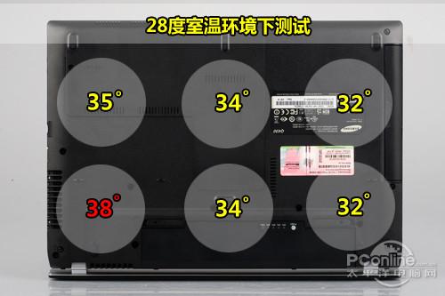 关于整机的散热情况,我们在运行3Dmark06大概半小时后进行了测试,具体情况如下:正面的中部偏左温度不是很理想,可能也是由于出风口在此的原因导致,温度达到了38°左右,这对使用键盘的感受有一定的影响。