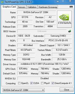 | 显卡 | nVIDIA GeForce GT330M(显存1024MB) | ||||