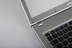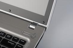 转轴部分没有太多的创新,三星Q430使用了比较大众化的下沉式转轴设计,不过转轴的材料同样是金属材质,这在一定程度上增加了连接的安全性,左右转轴处各有一个扬声器,由此产生不错的立体声效。金属圆形电源按键设计在键盘右上方,比较醒目。