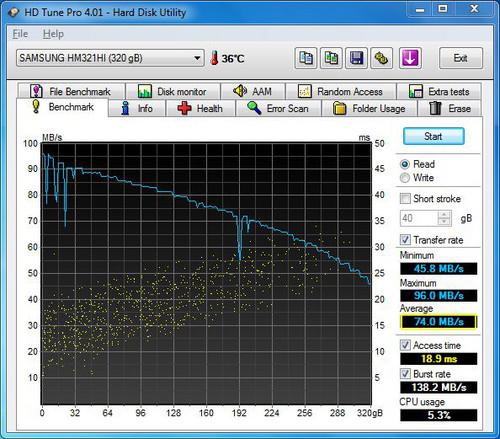 硬盘部分三星Q430采用了自家制造的产品SAMSUNG HM321HI,规格虽为5400转,但HD TUNE给出了平均74MB/s的传输速度,这比笔者测过的其他320GB(5400转)硬盘传输速度要高出近10MB/s,非常不错。CPU占有率 5.3%,温控36°同样表现出色。
