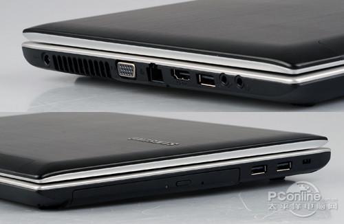 与大部分机器一样,左右两侧是机器接口的主要集中地,如图所示,左侧依次是电源插孔、VGA接口、网线接口、HDMI、USB和音频输入输出接口,而右侧设置有DVD刻录光驱、USB×2、安全锁孔。