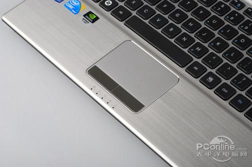 键盘出色,与之搭配的触摸板自然也不会差。手指滑动在经过磨砂处理过的触控区,感觉不错,摩擦力适中,定位也比较准确。两片银色金属按键键程适中,按压起 来不用很吃力,按压的声音也控制的比较不错。紧挨左右按键的是几个系统状态灯,通过此处可以清晰看到系统目前的状态。掌托的材质与顶盖一致,不过是银色的 金属拉丝效果,手腕托到上面也非常舒适。