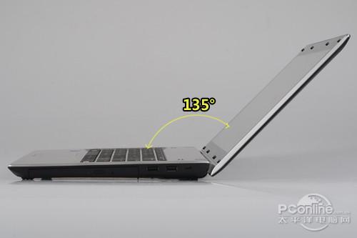 下沉式的转轴设计使得屏幕的张开角度为135°左右,基本可以满足用户不同环境下的使用需求。我们在试用过程中发现,机器在开启一定角度后再端起来移动,仅有很少的晃动余量,可见其做工的出色。