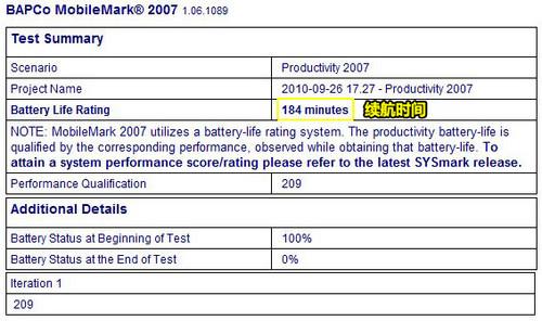 三星Q430的电池规格为11.1V/48Wh(4400mAh),同样属于大众水准。我们全盘格式化机器后安装了32bit英文版win7旗舰版操作系 统,安装必须的主板芯片组、显卡、网卡、无线网络驱动后,使用MobileMark2007进行了机器的续航能力测试。MobileMark2007可以 模拟用户的真实使用情况,故这种环境下得到的续航时间对用户最有参考价值,最终的测试时间为184分钟。三个小时的续航对于一款使用中高水准显卡的笔记本来说,属于不错的成绩了。
