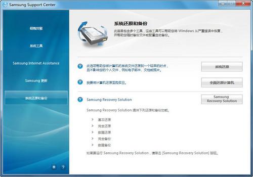 Samsung Support Center则提供了更为全面的服务,包括疑难解答、系统工具、自动更新、备份还原等等。用户使用这一软件可以查看到机器目前的状态以及相关的解决方案,同样为用户提供了很大的方便。