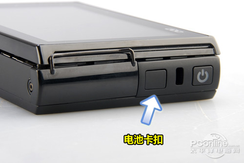 接下来我们把镜头拉近一些,一起来看看这款产品的细节表现,首先是接口布局。该机的左侧设置有电池卡扣、安全锁孔以及电源按键。下压电池卡扣后即可分离电池与机身,非常方便。