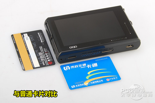 刚拿到这款产品的时候,笔者很难将它与搭载Windows 7操作系统的电脑联系到一起,4.8英寸的它只有普通手机的两倍大小左右,甚至比很多MP4、PSP还要小,这样一款产品在便携性方面的优势自然不用多说。为了让网友更直观的理解,我们将它普通银行卡对比拍照,如下图所示。