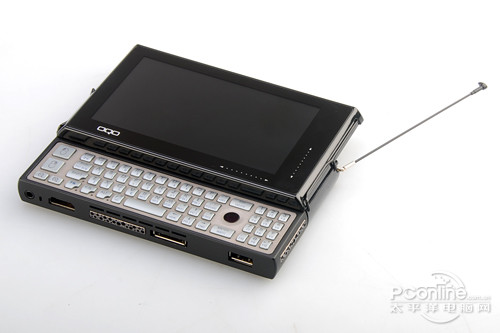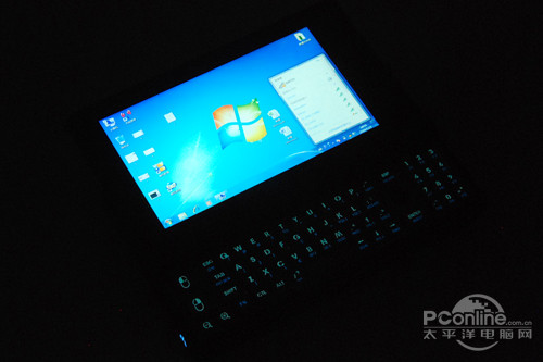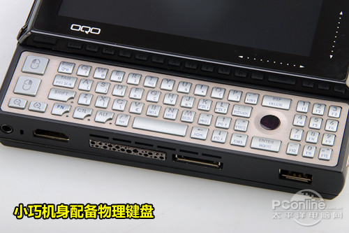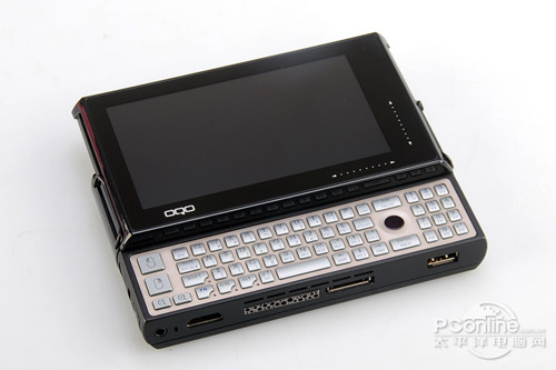 该机为滑盖式设计,推开屏幕后物理键盘即显现出来,这也是本机的特点之一,相对市面上很多只能触控操作的平板电脑而言,拥有键盘输入+触控输入的OQO便携电脑更易操作。此外,该键盘还是背光设计,在黑暗的环境下键盘会发出淡蓝色光亮,方便输入,这也在一定程度上弥补了按键较小的缺憾。