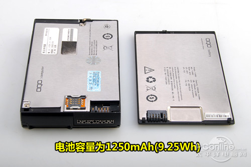 最后我们来看一下这款产品的电池。送到我们评测室的产品搭配有一块9.25Wh的电池,如果是日常的上网浏览网页、OFFICE操作、QQ聊天等,这款产品可以维持两个半小时左右。官网标配表中除了一块标准电池外,还有一块双倍容量电池,这样一来,该机脱离电源适配器的使用时间将进一步延长。