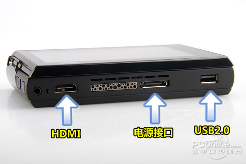 机器的底部是接口比较多的地方,依次有耳机插孔、HDMI高清接口、底部扬声器、电源接口以及USB2.0接口。看来,这款产品不仅在操作性方面给用户提供了很大的便利,在扩展方面同样做的很出色。