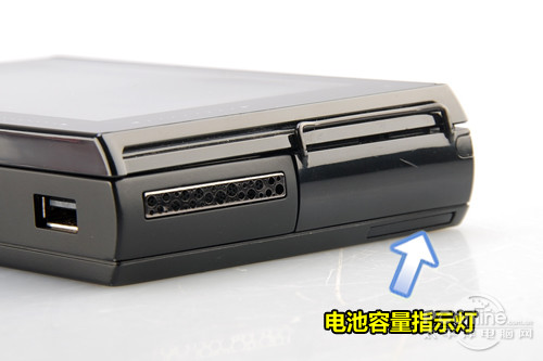 机身右侧设计有一个金属外壳扬声器以及电池容量指示按钮。轻按这个按钮,即使在不开机的情况下也可以看到目前电池的容量,非常人性化,如此设计在三星的很多产品上也有体现。但这个扬声器的位置稍有不妥,手持的时候会挡住声音。