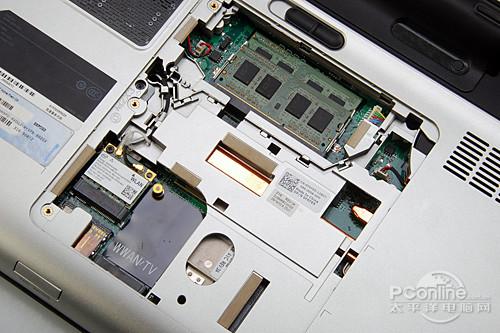 打开戴尔XPS L501X底部的机壳面板,用户可以方面的对内存、网卡、电视卡进行升级,如果想更换硬盘则必须通过卡口拆下掌托,较为繁琐且不便。