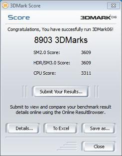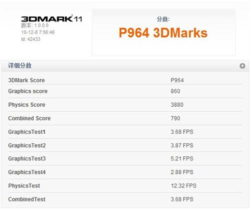 3DMark11在不久前发布,我们也第一时间用该程序进行了测试。3DMark11与3DMark Vantage的测试方式差异甚少,只是仅支持DX11 3D API的原因让它发生了质的改变。因为试用版只能在Performance模式下运行,而964的得分通过对比也只能算是中等水平。