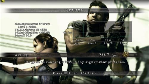 《生化危机5》的游戏画面效果得到了飞跃性提升,CAPCOM公司还为其引入了DX10特效。虽然本作属于移植作品,但对游戏本的硬件还是有一定要求的,但并不是很苛刻。在最大分辨率下,通过截图,我们可以看到在运行比较侧重实际游戏真实表现的Variable Benchmark环节,30.7的平均帧数能够做到基本流畅。而在四平八稳的Fixed Benchmark测试选项下,27.3的平均帧数对于游戏的流畅性则略有牵强。