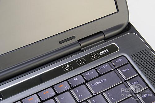 JBL的标志位于键盘左上方标志着戴尔XPS L501X采用了经过该品牌认证的扬声器,键盘右上方则为三个快捷键,用户可以根据需要设置对应的快捷方式、开启关闭无线通讯以及调出Waves MaxxAudio的控制面板。键盘左右两侧分别设有两个扬声器。