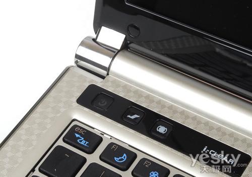 键盘上方提供了三个快捷键,分别是左侧电源键、电源管理软件和润眼切换键,对于海尔独有的电源管理软件我们会在后面段落中介绍,而关于海尔润眼技术我们也 有所了解,是通过调整屏幕像素比例,使其不刺眼。一般来说当用户想浏览网页或者进行文档处理时,通过这个按键实现一键切换非常方便。