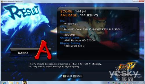 在卡普空经典游戏街头霸王4中,我们关闭垂直同步选项,其他设置选项为默认。整体平均帧数达到了114帧/秒,整体获得14494左右测试成绩,而我们画 面分辨率调至1366×768后,游戏画面帧数仍然能够达到55帧以上,可以说在高画质的情况下,可以达到最佳画面流畅度。