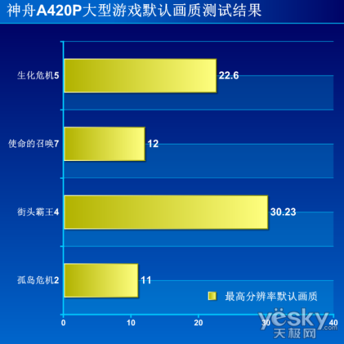 再来从主流的单机大型3D游戏来说,这一类游戏就对显卡性能有着较高的要求。我们选用生化危机5、街头霸王4、使命的召唤7和孤岛危机2这四款游戏在1366*768最高分辨率、游戏默认画质下测试神舟A420P,其中生化危机5的测试评级为C、街头霸王的测试评级为D,基本上都能满足运行游戏的要求。但在复杂的场景下还是会有画面卡滞。如果想要把神舟A420P当游戏笔记本,还是必须采用更低的画质设置才可以保证游戏过程的流畅。