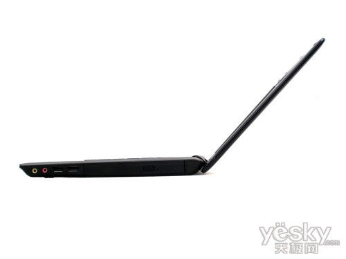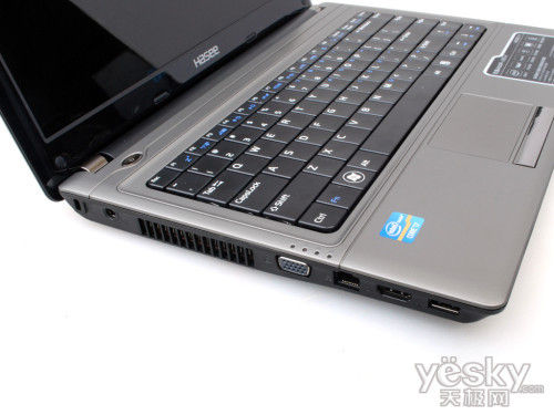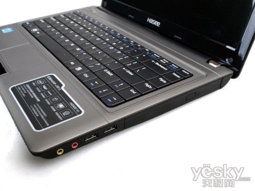 在机身两侧的接口上,神舟A420P设计得中规中矩,机身左侧分布着笔记本锁孔、电源插孔、VGA视频接口、RJ45网络接口、HDMI高清接口和一个USB 2.0接口,机身右侧分布着音频插孔、两个USB 2.0接口和DVD刻录光驱。神舟A420P的接口分布较为宽敞,为降低成本没有设计任何其他接口,三个USB接口对于14英寸笔记本来说也基本够用,其中机身右侧的两个USB接口的方向是倒置的。
