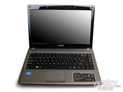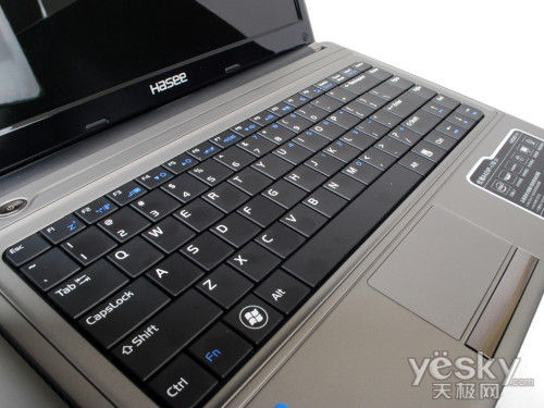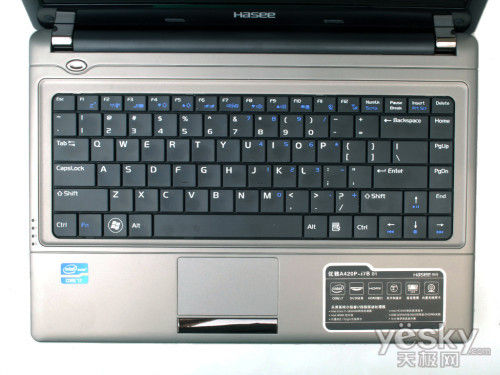 在C面,神舟A420采用了香槟金色的面板设计,键盘左上角为电源按钮,掌托上贴有Intel第二代酷睿i7处理器和神舟A420P的参数标签,非常简洁。