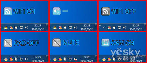 笔者注意到,除了以上这4颗LED指示灯,神舟A420P机身上没有设计其他指示灯,笔记本的无线网络开关、触摸板锁定、大小写锁定、屏幕亮度音量调节等状态只能通过安装随机光盘中的FnKey OSD程序后在屏幕右下角显示。
