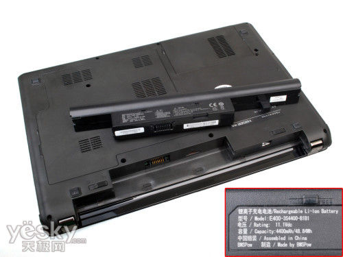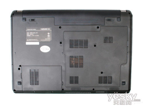 再来看看神舟A420P的机身底部,底部的面板上分布了许多散热口,并可以很容易地拆卸,便于用户对硬盘以及内存等进行升级。