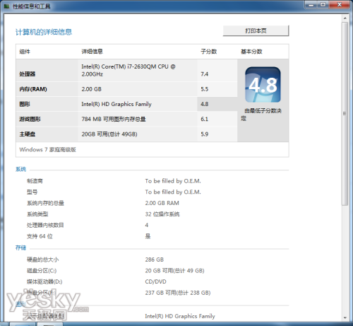 神舟A420P-i7BD1采用Intel HM65芯片组,搭载了Intel第二代酷睿i7-2630QM处理器、三星5400转的320GB硬盘和2GB的劲芯(Goldenmars)单条内存,显卡则是采用集成在Intel酷睿i7处理器上的Intel Graphic HD 3000核芯显卡。神舟A420P在Windows体验指数中的得分为4.8,处理器得分7.4、内存5.5、游戏图形6.1、硬盘得分5.9,没有明显的短板。