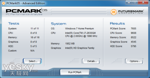 在PCMark 05和PCMark Vantage的测试中,神舟A420P得分分别为7605(PCMark 05)和5978(PCMark Vantage)。从具体的得分来看,Intel酷睿i7-2630QM处理器成为了最大的亮点,硬盘以及内存的得分也表现出色,仅在游戏的项目得分上最低。对于不是以游戏笔记本来定位的神舟A420P来说,日常办公、普通娱乐应用都是完全能够轻松应付的。