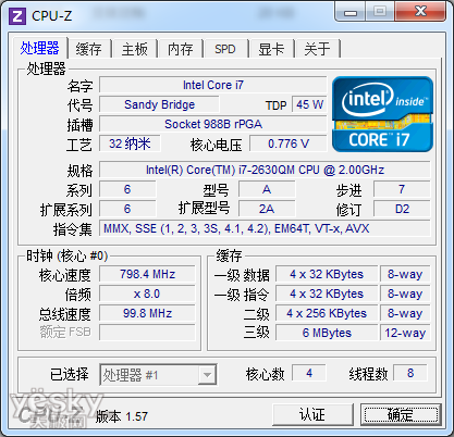 再来看看神舟A420P的单项性能测试结果。Intel第二代酷睿i7-2630QM处理器采用32nm工程制艺,拥有6MB三级缓存,四核八线程,主频2.0GHz,通过睿频加速技术最高可达2.9GHz,最大热功耗为45W。