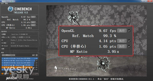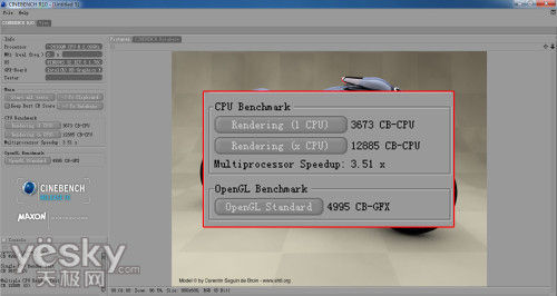 神舟A420P在CINEBENCH R10和R11.5测试下的得分分别为:单核3673、多核12885、OPENGL 4995和单核1.05pts、多核4.14pts、OPENGL 9.67fps,Intel Ci7处理器的优势非常明显,对于处理复杂的压缩解压、批量处理的任务时能够节约更多的等待时间。