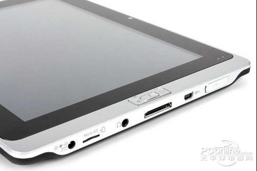 万利达T8平板电脑接口统一置于机身右侧,使用时非常好找,在这里我们看到了常用的USB接口、迷你USB接口、DOCK数据线接口、耳机接口、Micro SD读卡器和电源适配器接口,两个USB接口的设计比较实用。本机可以直接读取U盘、移动硬盘上的数据,播放电影或查看资料都没有问题,急用时,可以节省一些拷贝的时间。