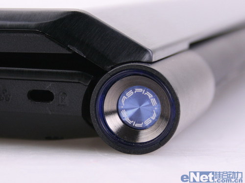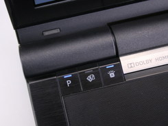 左右两边机身转轴位置,分别设置了功能按键。其中左边的三个键分别为:用户自定义按键、Clear.fi启动按键和键盘背光按键。右侧为电源键。按键都带有浅蓝色背光灯,点亮后非常显眼。