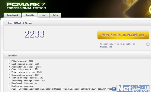 首先我们通过PCMARK 7软件来测试整机性能。PCMARK 7是全球著名图形及系统测试软件开发公司Futuremark发布的最新一代整机性能测试工具。和历代前辈一样,PCMark 7也是一套针对PC系统进行综合性能分析的测试套装,不过PCMARK 7只针对微软Windows 7操作系统。PCMark 7包含七个不同的测试环节,由总共25个独立工作负载组成,涵盖了存储、计算、图像与视频处理、网络浏览、游戏等PC日常应用的方方面面。宏碁 Aspire 8951G的综合得分为2233。
