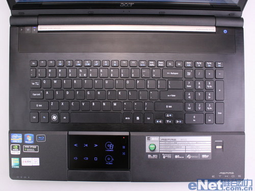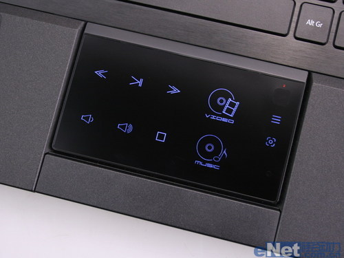 宏碁Aspire 8951G的触摸板面积非常宽大,触摸板还集成了多媒体控制功能,通过右上角的按键开启功能,功能按钮指示灯会亮起,用手指触摸功能图标实现对视频和音频的播放控制。
