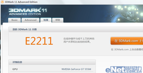 3DMARK 11的Entry模式,适用于大多数笔记本和上网本,测试分辨率为1024*600,支持低负载。宏碁Aspire 8951G搭载的GT555M显卡的测试成绩为2211分,相比GT540M 1700左右的得分,性能提升30%以上。