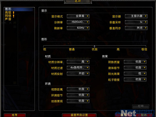 《魔兽世界》对电脑的性能要求不是很高,测试时我们将游戏分辨率调整为显示屏的最高分辨率1920*1080,其余设置保持默认进行测试。