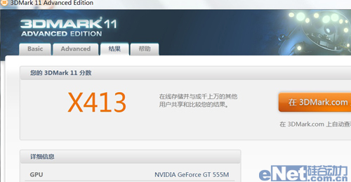 3DMARK 11的Extreme模式,是测试的最高模式,对性能的要求最高,测试分辨率达到了1920*1080的全高清分辨率,适用于高端游戏计算机。宏碁Aspire 8951G的测试得分为413分。