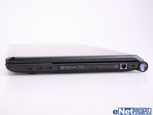 机身右侧的提供了3个USB2.0接口、蓝光刻录光驱、RJ-45以太网口和电脑安全锁孔。多达5个的USB接口方便了用户接驳更多的设备。蓝光光驱的加入,进一步丰富了影音功能。
